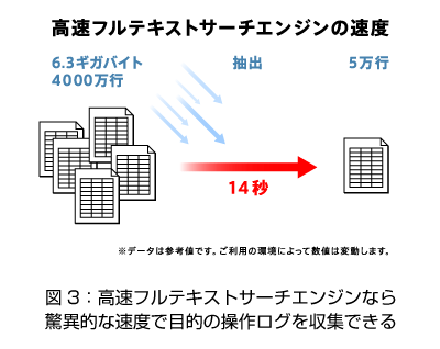 非効率な個所を見直し効率のよいところに投資するのは会社として重要ですが、客観的な事実に基づいたデータを集めるのは困難です。こうした点からも、操作ログの持つ客観性が役に立ちます。さらに、操作ログをより効果的に活用するために、検索効率のよいサーチ・エンジンを選択することが肝心です。