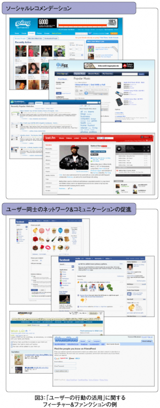 まずは、ユーザーによる評価や意味づけを表示する側のフィーチャーやファンクションです。裏側のロジックを工夫することによって、いわゆる集合知として機能しますので、広い意味でのソーシャルレコメンデーションといってよいでしょう。