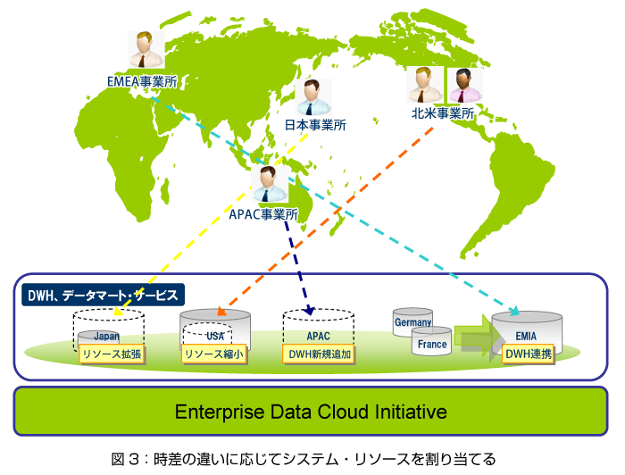 日本と北米には時差があるため、日本での処理負荷がピークとなるタイミングでは、北米事業所のDWHに割り当てているサーバー・リソースを縮小させて日本に割り当てるといった運用が可能になります。