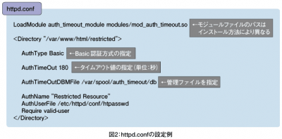 次にApacheの設定ファイル「httpd.conf」を前回使用した基本的なbasic認証の設定(http://www.thinkit.co.jp/article/120/2/2.html)を元に、図2のように修正します。