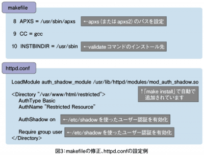 展開したディレクトリに移動し、「make」を実行しますが、場合によっては図3のような修正が必要になります。「make install」後、mod_auth_shadow.soファイルがモジュールディレクトリ(CentOSでは/usr/lib/httpd/modules/)にインストールされます。また同時にvalidateコマンドもmakefileで指定したパス(/usr/sbinや/usr/local/sbin)にインストールされます。