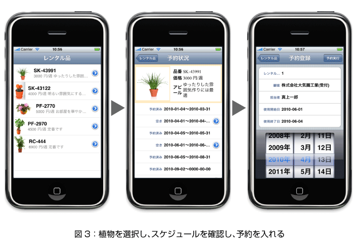 本連載では、iPhoneで稼働する業務ソフトの紹介をします。今週はまず概要を説明し、次週以降、サーバ側の処理の解説、iPhone側の解説、そしてiPad対応させる場合の解説と続けることにします。テーマは「観葉植物のレンタルのセールスマン」として、レンタル可能な植物をリストから選択し、予約を入れるというところに絞った機能にします。