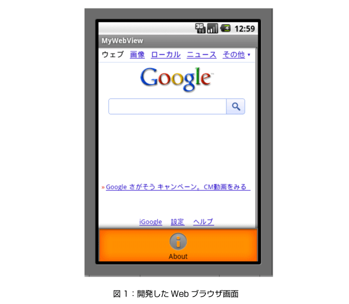 GoogleのWebページが表示されたら、Menuキーを押してみましょう。Aboutアイテムが配置されたオプション・メニューが表示されるはずです(図1)。今はメニューを選択しても何も反応せずメニューが隠れるだけです。