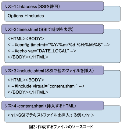 SSIを使った例をもう1つ紹介しましょう。実験用ディレクトリにリスト3、リスト4をそれぞれ見出しにあるファイル名で作成してください。その後、Webブラウザで「include.shtml」にアクセスすると、リスト4の内容がブラウザに表示されます。リスト3のinclude要素により、リスト4の内容がそこに挿入されたのです。