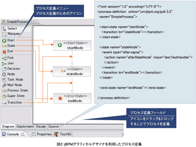 今回はプロセス定義名のとおり、開始ノード、ステートノード、および終了ノードのみで構成される、シンプルなプロセスを定義します。各ノードに名前を付け、それぞれのノードをプロセス定義フィールドに配置し、Transitionで遷移させます。これでプロセス定義は完成です。