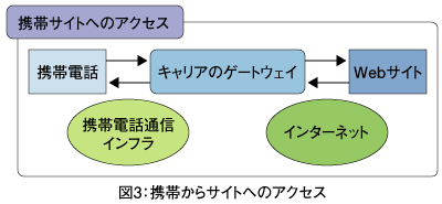 しかし携帯の場合、携帯サイトへのアクセスは、携帯端末から直接アクセスがくるわけではなく、キャリアのゲートウェイサーバーを通ってからアクセスされることになります。つまりローカルネットワークにアクセスできないのはもちろんのこと、アクセス元のIPアドレスもゲートウェイで割り振られてしまうため、ほかのユーザーと見分けることができなくなっています。そのため開発途中の携帯サイトを携帯端末実機で確認するには公開領域に置くしかありません。