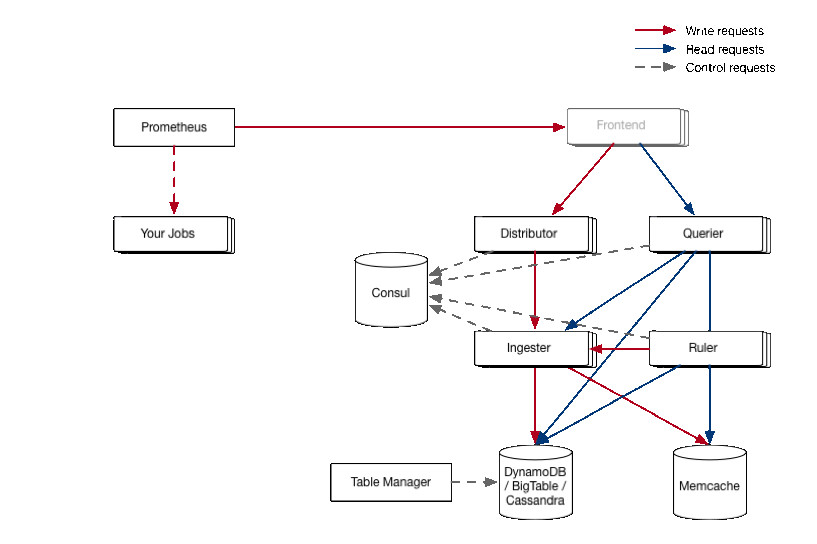 ここでのポイントは、データを受け取るDistributorはIngesterにデータを送信する際に必ず最低3つのIngesterに送信することで、Ingesterがダウンした時やデータを正常に受け取れなかった場合でもデータの欠損が生じないような設計になっていることだろう。数千数万という規模のサーバーが稼働するクラウド環境において、監視を行うPrometheusも大量のデータを処理することになる。そしてそれを受け取り、タイムシリーズデータにする処理を受け持つバックエンドも、マスター&スレーブという単純な組み合わせではなく、常に稼働し続けることを義務付けられている構造をとっている。これは、実際にクラウドサービスを提供しているWeaveworksの経験からのものだろう。なお、この部分のデザインはAWSのDynamoDBを参考にして設計されたということを明記している辺りに、障害に耐えうるアーキテクチャーを目指しているということが理解できるだろう。