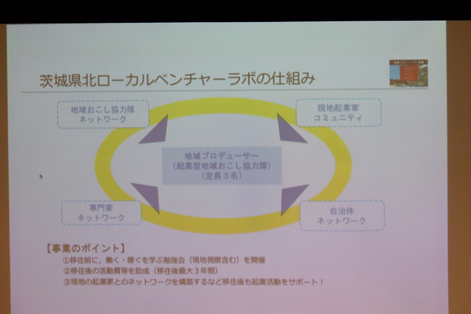 斎藤氏は、「移住したい、けど移住しない」理由として「仕事とお金の問題だ」と指摘する。そこで、茨城県北ローカルベンチャーラボでは、月額166,000円・滞在中の家賃・起業に際する活動資金が最大3年間支給される、という3点を地域おこし協力隊への支援として採用している。「ミニマムな金額ではあるが、一緒に仕事を創っていきましょう」というのが今の気持ちだ」と語った。