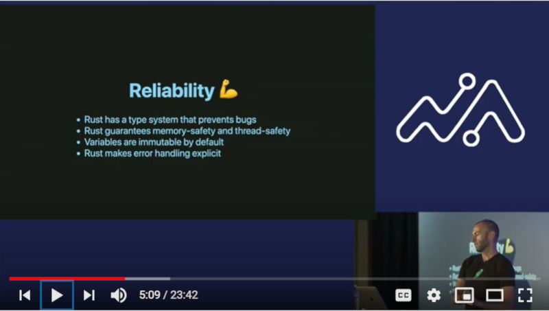 Rustが強い型付けをデフォルトとするシステムであり、メモリーセーフ、スレッドセーフであることを次に説明。またエラーハンドリングがExplicitであり、プログラマーがエラーをちゃんと対処する必要があることはこの後の説明でも繰り返し解説された。
