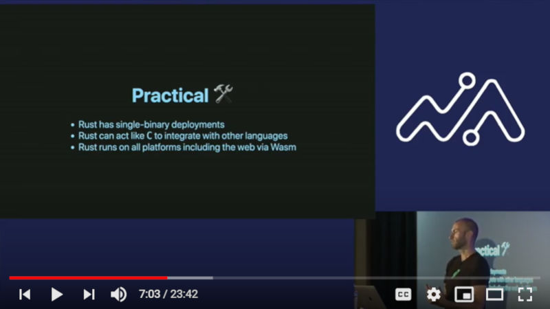 3つ目の特徴であるPractical(実用的)という部分に関しては、Rustの実行形式ファイルがシングルバイナリーであり、依存するライブラリーをパッケージングする必要がないこと、JVMのような仮想マシン型ランタイムが不要なことなどを挙げた。またWindows、Linux、iOSなどさまざまなプラットフォームで実行できること、ブラウザでさまざまなコードの実行を可能にするWebAssemblyなどにも言及して幅広い実行環境を強調した。特にこれからのサーバーレスの時代を見据えて、ファンクションとして実行されるコードが小さくできるというのは大きなアドバンテージだろう。