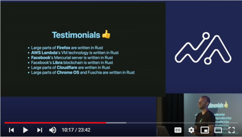またさまざまな企業においてRustの利用が拡がっていることを説明したが、Rustの開発母体であるMozilla、AWSのサーバーレス実装、Lambdaの仮想マシン、Googleが開発を進めるLinuxカーネルを使わない新OSのFuchsia、Chrome OSなど、かなり具体的に例を挙げていることはポイントだろう。