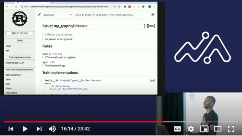 またコードがアップデートされるなかで「この変数は今後使われなくなるので、他の変数を利用しろ」といった互換性を維持しながら新しいコードに移行する際に便利な機能も紹介された。これは「#[deprecated」という属性を設定することで、「何を代わりに使えば良いのか?」をそのコードを利用する別のプログラマーに明示できる機能だ。さらにGraphQLにも同等の機能が存在することを紹介し、RustとGraphQLが同じように使えることを説明した。