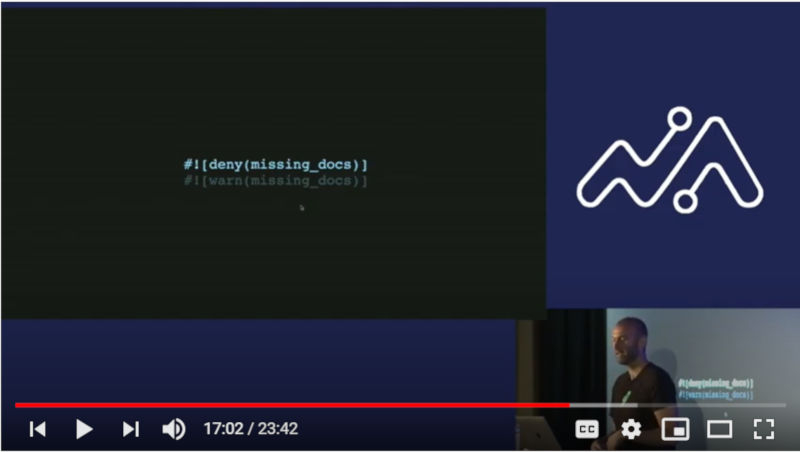 さらにドキュメントがオマケとして扱われていない例として、「#![deny(missing_docs)]」という属性を定義することによって、ドキュメントがないコードにおいてコンパイルが失敗するという仕様になっていることを解説した。