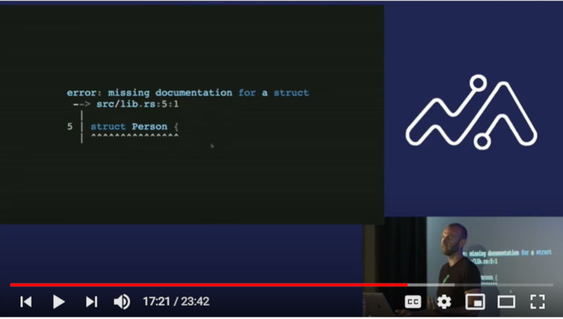 またエラーメッセージが「どこにコメントがないのか?」を明示してくれることを解説し、Rustのコンパイラーが非常にユーザーフレンドリーであることを強調した。