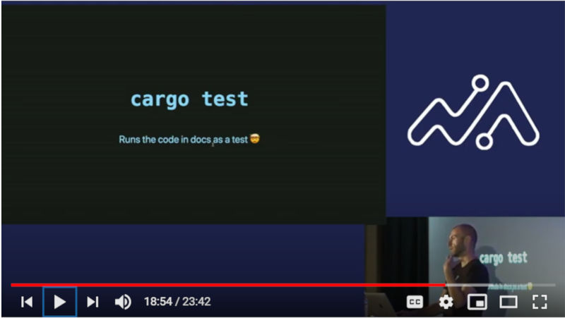 このコメントがCargoによってドキュメントとして生成された例が次のスライドだ。ドキュメントのためのコメントにはmarkdownが利用できることもエンジニアにとっては使いやすいポイントだろう。