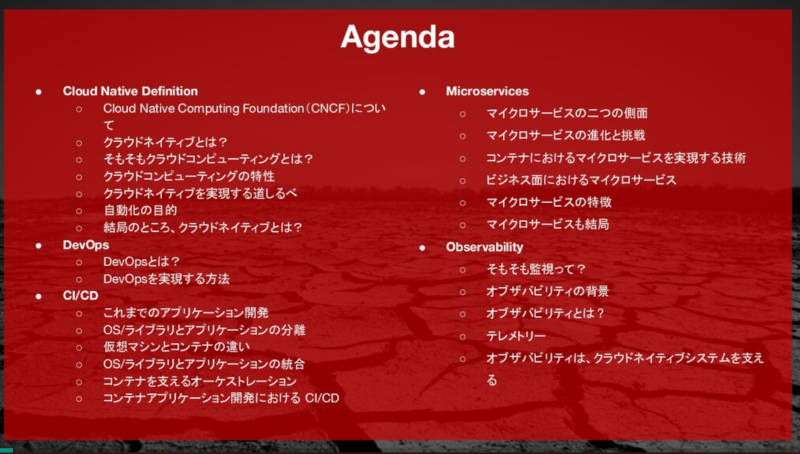 全体的にCNCFのトレイルマップに沿いながらも、議論の多い部分、DevOpsにおける組織の作り方やオブザーバービリティにおける観点の違いなどについては深入りを避けた内容となっている。また、セキュリティやクラウドネイティブなデータベース、ストレージなどについては敢えて盛り込まれていない。