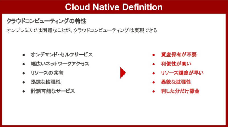 CNCFの生い立ちやCNCFによるクラウドネイティブの定義、NISTによる定義などを引用して解説を行った後に、クラウドコンピューティングの特性を説明。ここではサーバーなどを保有せず柔軟な拡張性を持つ部分や、使った分だけ課金されるという部分を説明した。