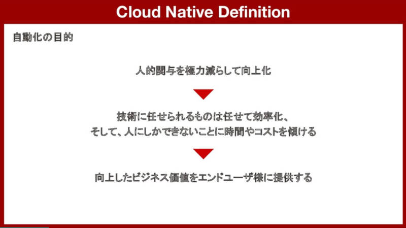 自動化の目的は、究極的にはビジネスの価値の増大であり、そのためには人的リソースを自動化によって削減し、よりビジネスに関わる部分に注力することが必要だと解説した。
