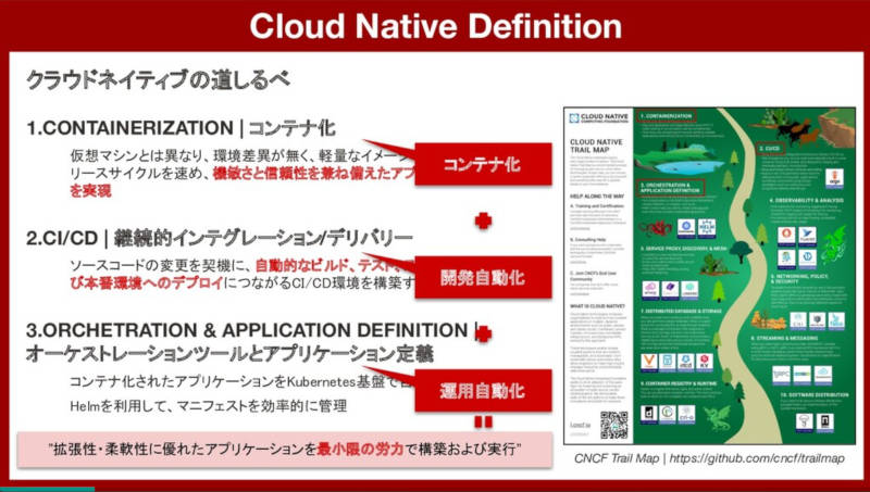 そしてCNCFのトレイルマップを参照しながら、コンテナ化、CI/CDによる開発の自動化、コンテナオーケストレーションによる運用の自動化が進んだとして、自動化は人的関与を減らして効率を上げること、結果としてビジネスの価値創造のほうに人的リソースを使うべきだと解説した。