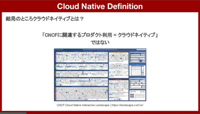 ただし「結局のところクラウドネイティブとは?」というスライドでは、CNCFのソフトウェアを使うことがクラウドネイティブというわけではないと説明。クラウドネイティブの定義や目的に沿ったソフトウェアが集結しているのがCNCFのエコシステムであるのは自明なのだが、市川氏の意図としてはその他のソフトウェアを使ってもクラウドネイティブは実践できるという意味なのだろう。