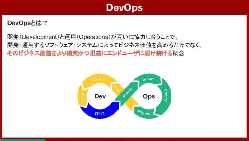 次にDevOpsの解説に移り、開発チームと運用チームが互いに協力することでビジネスの価値を増大させると説明。