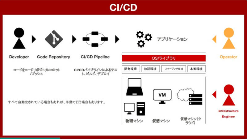 DevOpsを実現するための方法としてアジャイル開発とCI/CDがあると説明した。小規模な開発チームによって素早く開発~テストを回してリリース回数を増やすアジャイル開発と、人的操作を極力省略した自動化によってリリースされた成果物を本番環境に配備するCI/CDが必要だと解説して、ここからCI/CDの説明に入った。