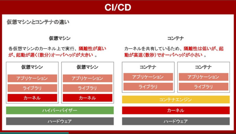 ウォーターフォール型の開発とコンテナを使ったアジャイル開発には大きな違いがあるとして説明を行った後で、仮想マシンとコンテナの違いを解説。