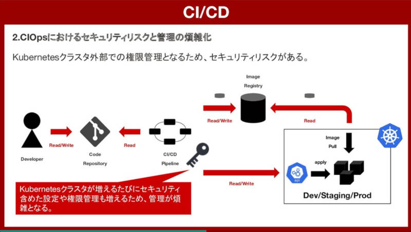 またCI/CDのタイプとしてCIOpsとGitOpsを解説し、CIOpsにはセキュリティリスクが発生する可能性があることを解説。