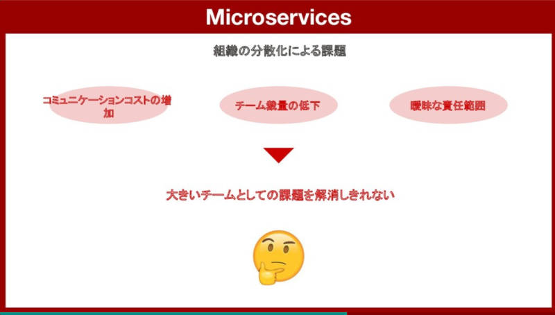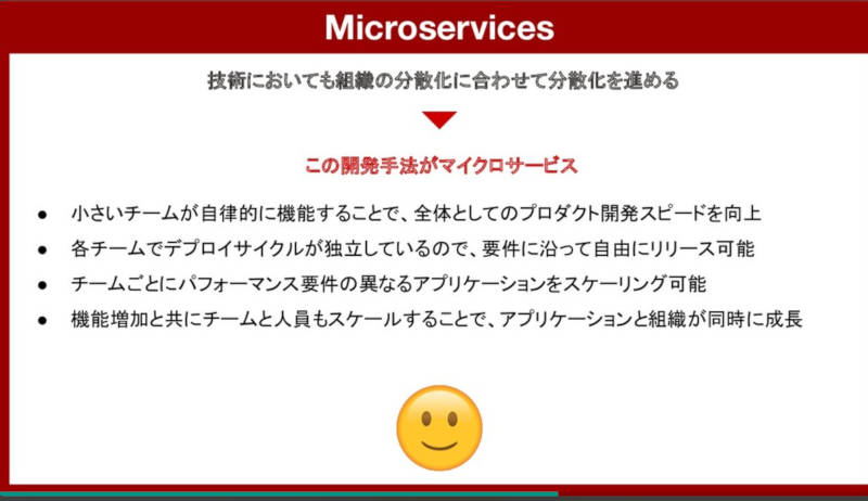 組織を小さくすることと合わせて、テクノロジーもマイクロサービスを実装できるものを選択するべきと説明しているが、前のスライドで提起した問題点の解決策を提示していないのは若干、不親切と言えるだろう。
