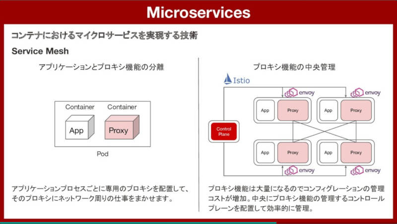 さらにKubernetes上でマイクロサービスを実現するサービスメッシュのIstioを紹介し、サイドカーとしてデプロイされたProxyがネットワーク機能を受け持ち、他のPodと連携するアーキテクチャーを紹介した。