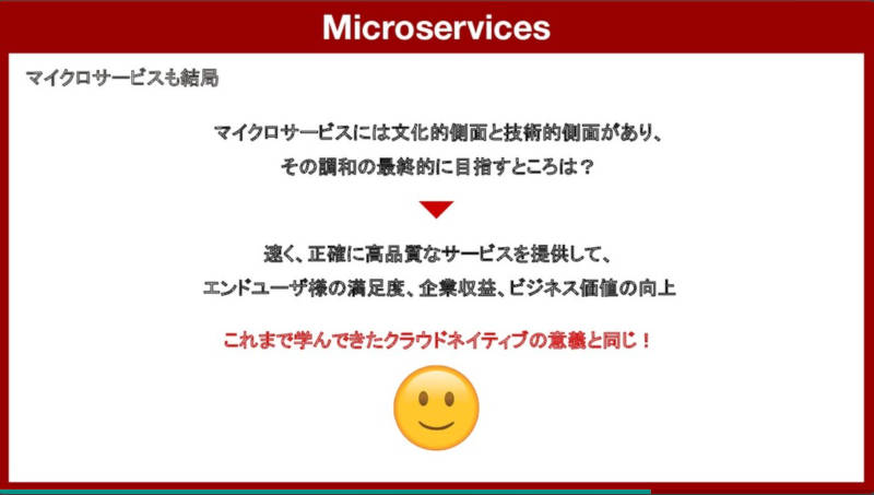 また複数の小さなコンテナが連携して実行されるマイクロサービスについても解説を行い、大きな組織から小さな組織の集合体への変化に合わせて分散化を進めるためのものとした。またここで言う「小さな組織」のサイズはTwo Pizza Rule、つまり2枚のピザを分け合える程度の人数に抑えるべきだという知見を紹介した。