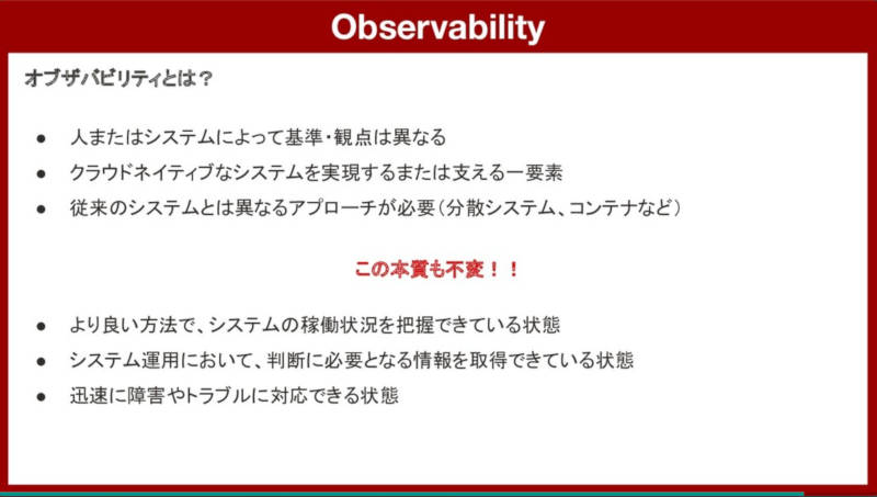 オブザーバービリティについても解説を行ったが、人によってオブザーバービリティに対する認識が異なる場合があり、従来のシステムと比べても異なるアプローチが必要と説明し、オープンソースソフトウェアだけではなく商用ツールも含めて多くの選択肢があることを解説した。