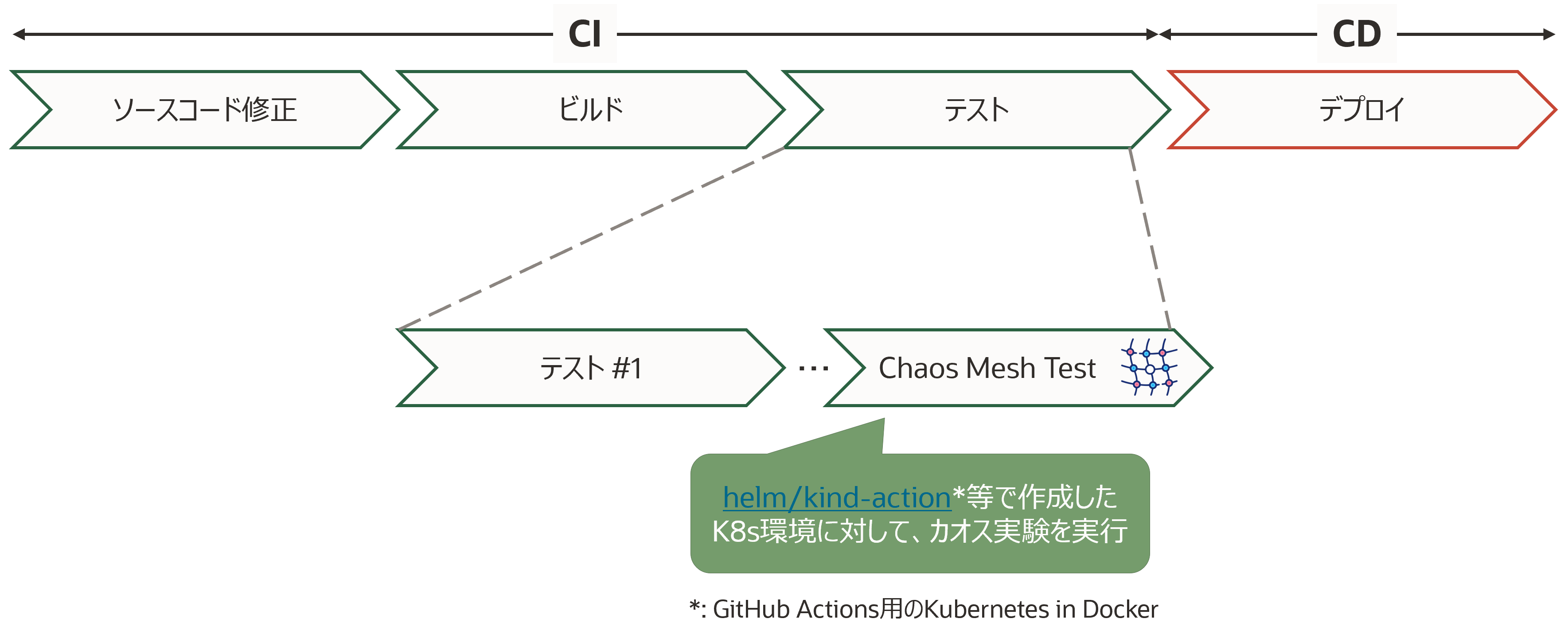 Chaos Meshには、CI(Continuous Integration)の一環として組み込むためのGitHub Actionsがマーケットプレイスで公開されています。helm/kind-actionなどを用いてGitHub Actions上に一時的なKubernetesクラスタを構築し、カオス実験を行った信頼できる資産を各環境に配備することが可能となります。CI上という一時的な環境のため実行できることは限られますが、影響範囲の局所化に対して戦略的なアプローチを取ることができます。