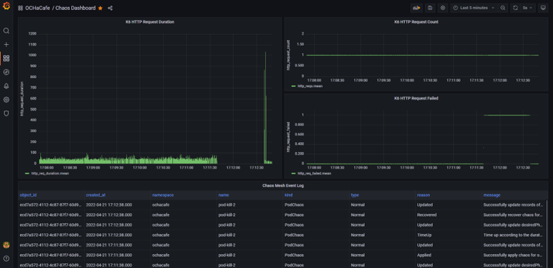 Chaos Meshのワークフロー機能を活用し、k6を用いた定常状態の測定、WordPressとMySQLの間の通信に1sの遅延を注入した際の平均応答時間の測定、Slack通知までを自動化しています。さらに、k6の実行結果とChaos Meshのイベントログを同じGrafanaのダッシュボードに表示することで、イベント注入のタイミングと測定結果の紐づけも分かりやすくなります。