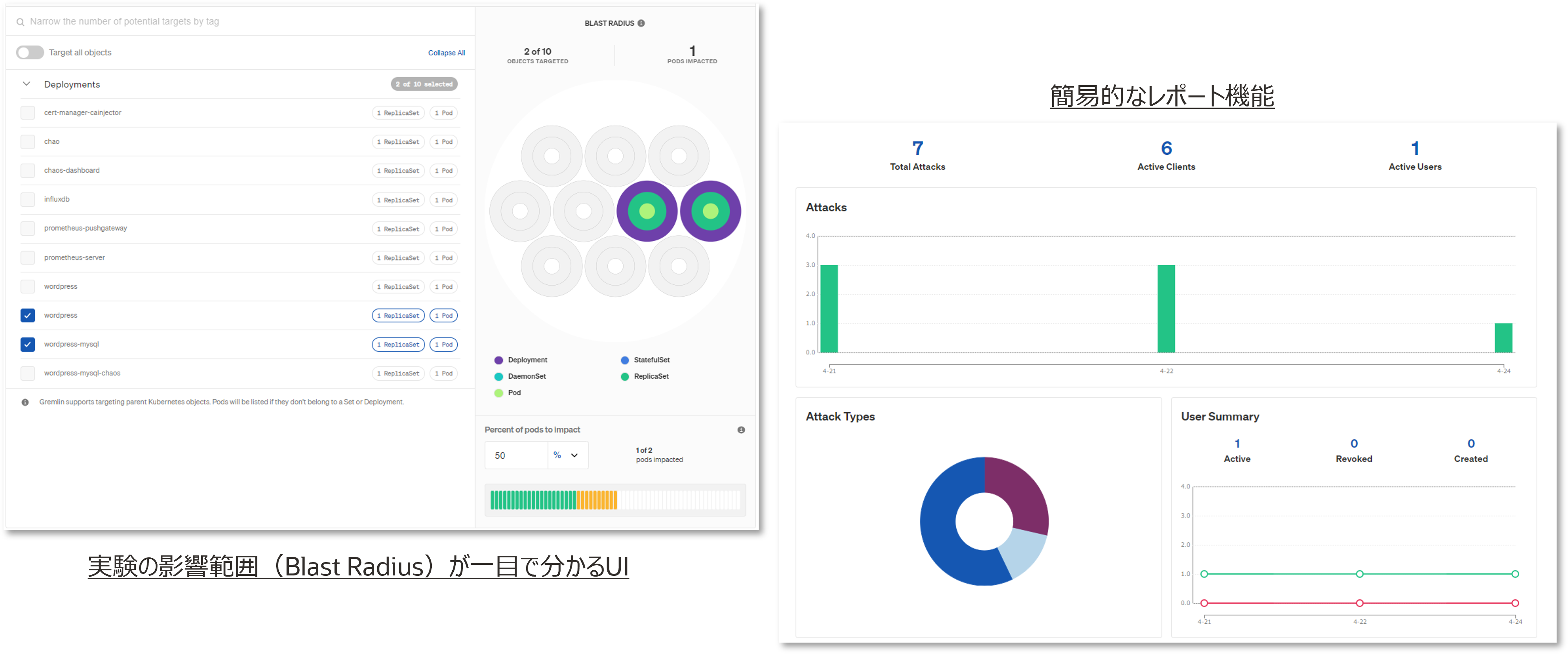 Gremlinは、Gremlin社がFailure as a Serviceのコンセプトで開発したカオスエンジニアリング用のSaaSプラットフォームです。インスタンスにエージェントを仕込む形で様々な障害をシミュレートできます。また、SaaSならではのプリセット済みのカオス実験のシナリオや簡易的な実験レポート機能も提供されています。