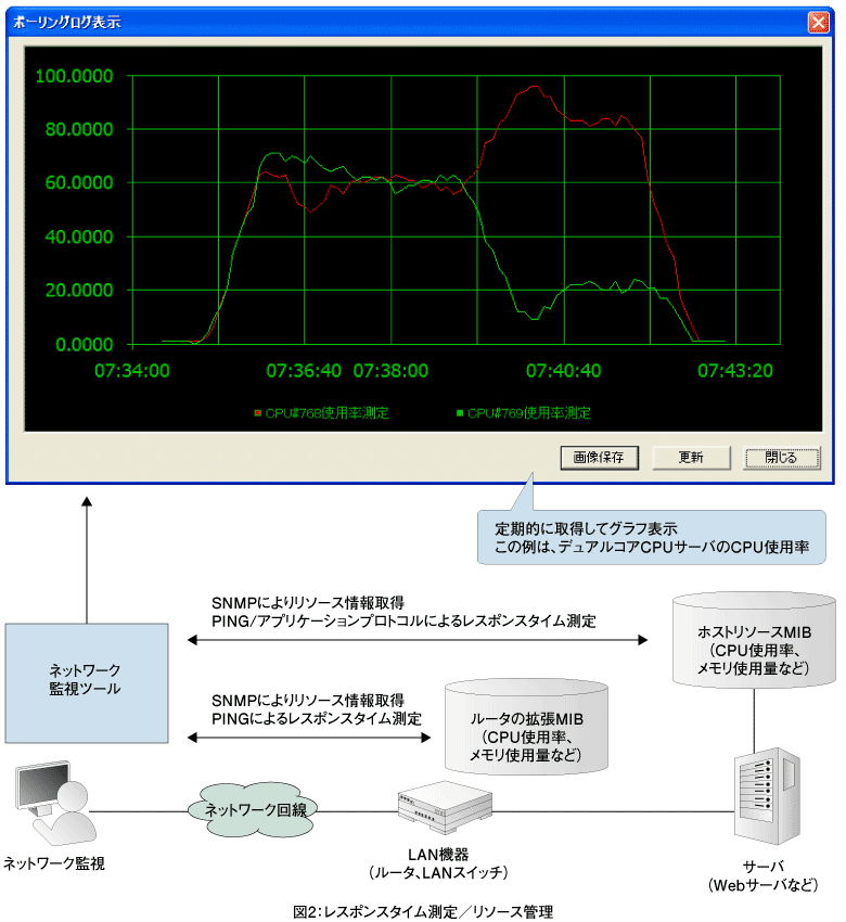 ITシステムのパフォーマンス低下の原因が、サーバや経路上のルータの性能に起因するものか判断するためには、これらのリソースをモニタする必要がある。この方法にはいくつかの技術があるが、OSや機器の種類に依存しないSNMP(Simple Network Management Protocol)の利用が有効である。