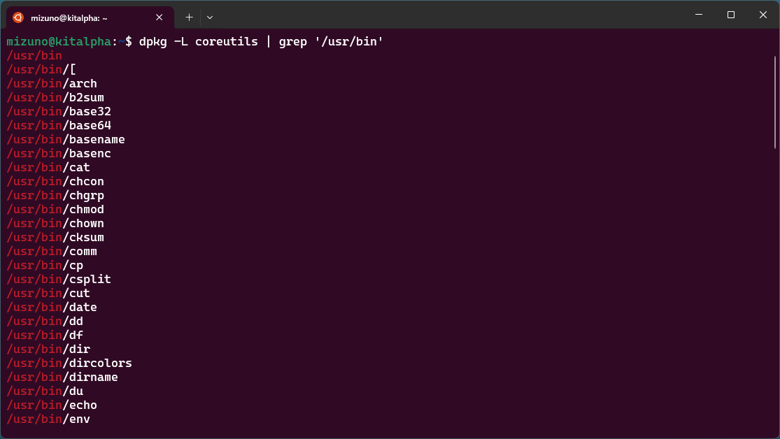 Coreutilsは、Ubuntuにおいて「coreutils」パッケージによって提供されています。第3回で紹介したdpkgコマンドを使って、coreutilsパッケージの中身を調べてみましょう。