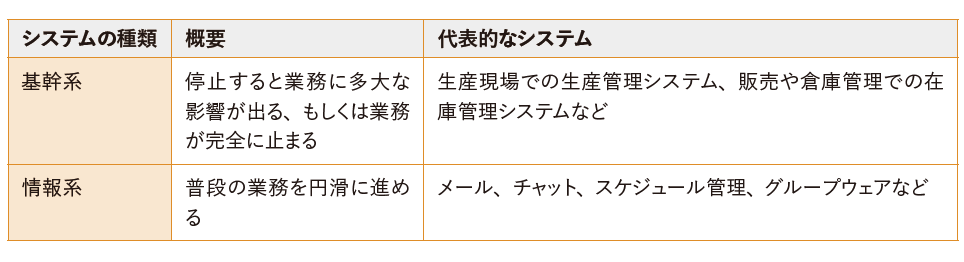 一般に、組織の中で使うシステムは基幹系システムと情報系システムに分類されます(表1-1)。