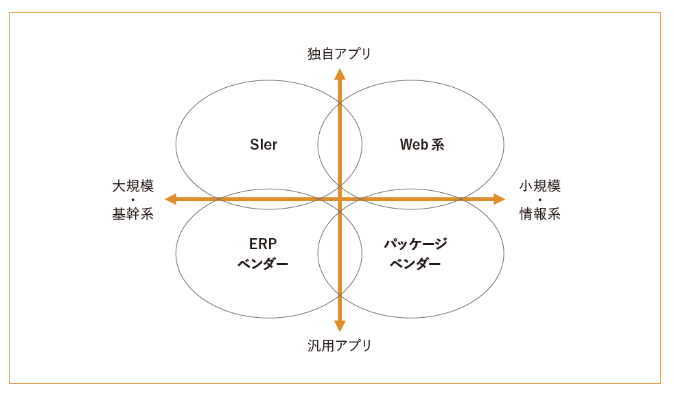 そして、どの企業でも使われるような汎用アプリか、企業や個人によって使い方が違う独自アプリかによっても異なります。これらを開発する企業は図1-1のように分類できます。1つの企業で異なる種類のシステムを開発していることもありますが、それぞれの企業には得意分野があります。