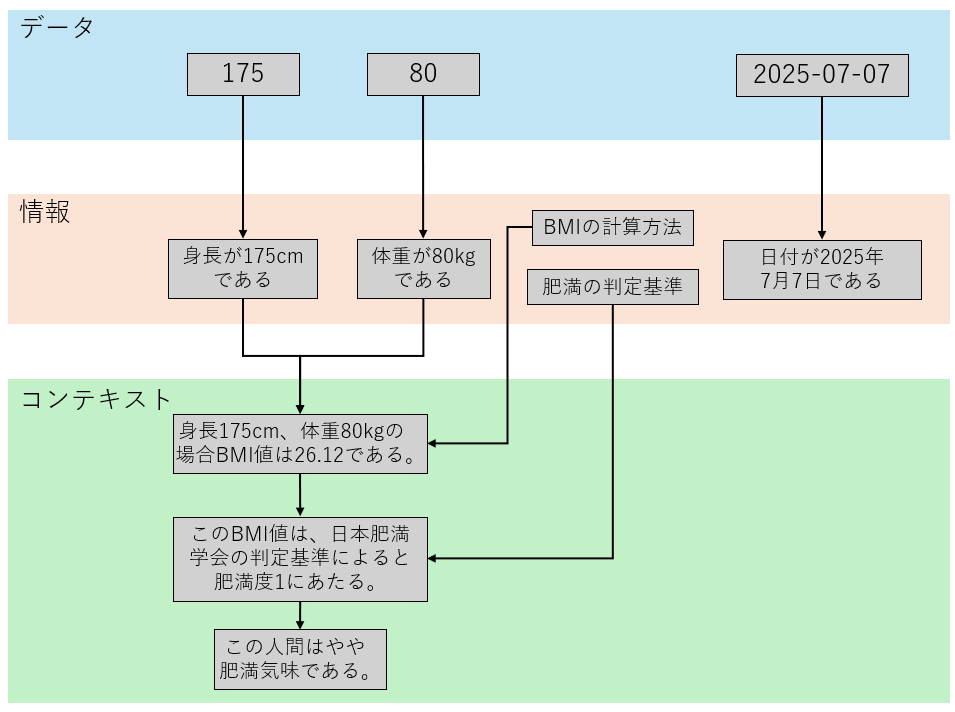 しかし、コンピュータにとっては「体重がXXkgである」「身長がYYYcmである」という情報だけではそれ以上の意味を持ちません。AIがこれらの情報から体型を推論するためには、「これらの情報が体型という観点からどういう意味を持って関連付いているのか」を認識している必要があります。この関係性をAIに認識させることこそがコンテキストの役割なのです(図1)。