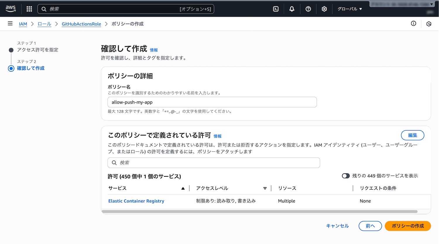 【Amazon ECR プライベートリポジトリにイメージをプッシュするための IAM アクセス許可】