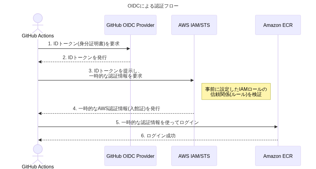 GitHub Actionsがワークフローを実行すると、GitHubは「このワークフローは正真正銘、あなたのリポジトリから実行されました」ということを証明する「身分証明書(OIDCトークン)」を動的に発行します。