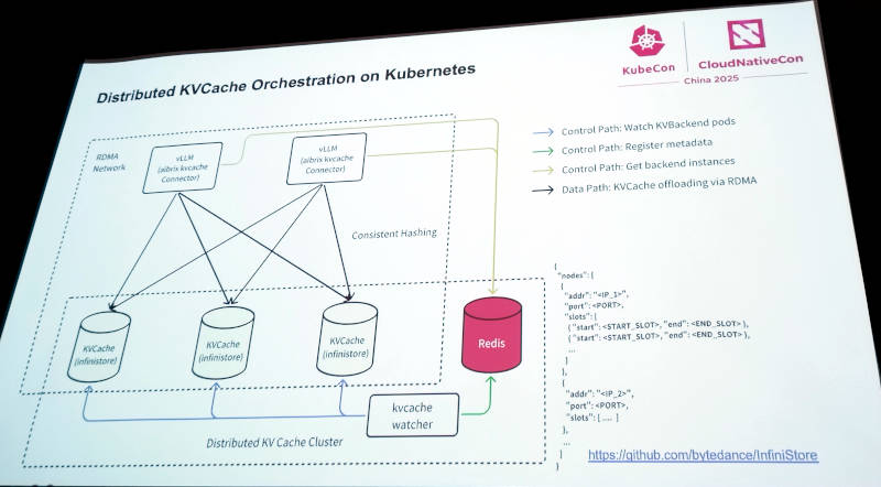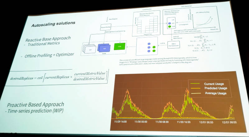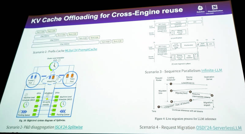 Xie氏は前のスライドをさらに詳細に分解したアーキテクチャー図を使ってAIBrixを解説。データプレーン、コントロールプレーンに分けてAIBrixを構成するモジュールを見せた。コンテナ(Pod)にvLLMが推論エンジンとして構成され、そこにベースとなるモデルとLoRAによるチューニング、サイドカーとしてモデルローダー、オブザーバビリティのためのランタイムエージェントやWatchdogなどが加えられ、それがA100やL40と言った異機種GPUにスケジューリングされ、中間結果であるKV Cacheは複数のノードに分散されて実装されるという仕組みだ。実際には「これは細か過ぎて読めないかもしれないけどね」とコメントしながらも真面目に参加者に情報提供を行っていることを感じた瞬間であった。