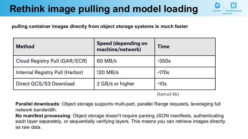 またどこからイメージやデータをダウンロードするのか? についてはGoogleのGARやAWSのECRを使った場合、CNCFのプロジェクトでもあるHarborを社内ネットワークに実装した場合、そしてS3などのクラウドに存在するオブジェクトストレージを使った場合で処理時間に大きな差が出てくると解説した。