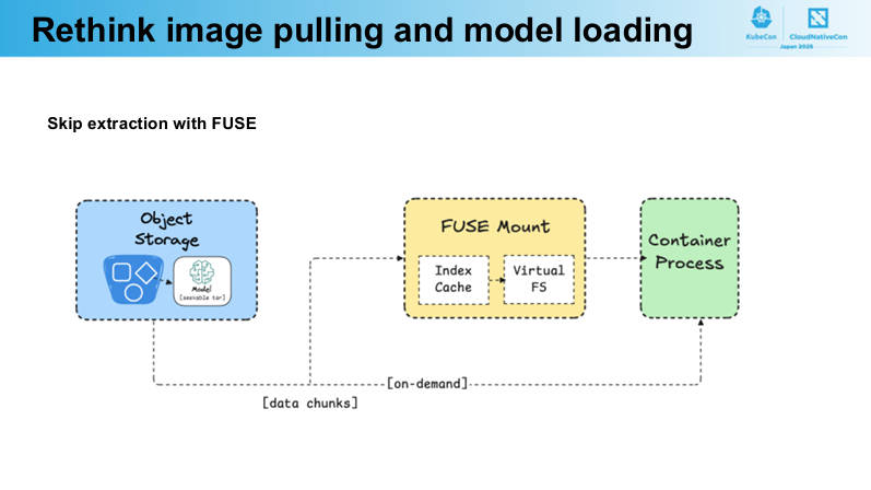 ここからモデルデータをレジストリ経由ではなくオブジェクトストレージに置いたうえで、FUSEを使って高速化する仕組みを解説した。