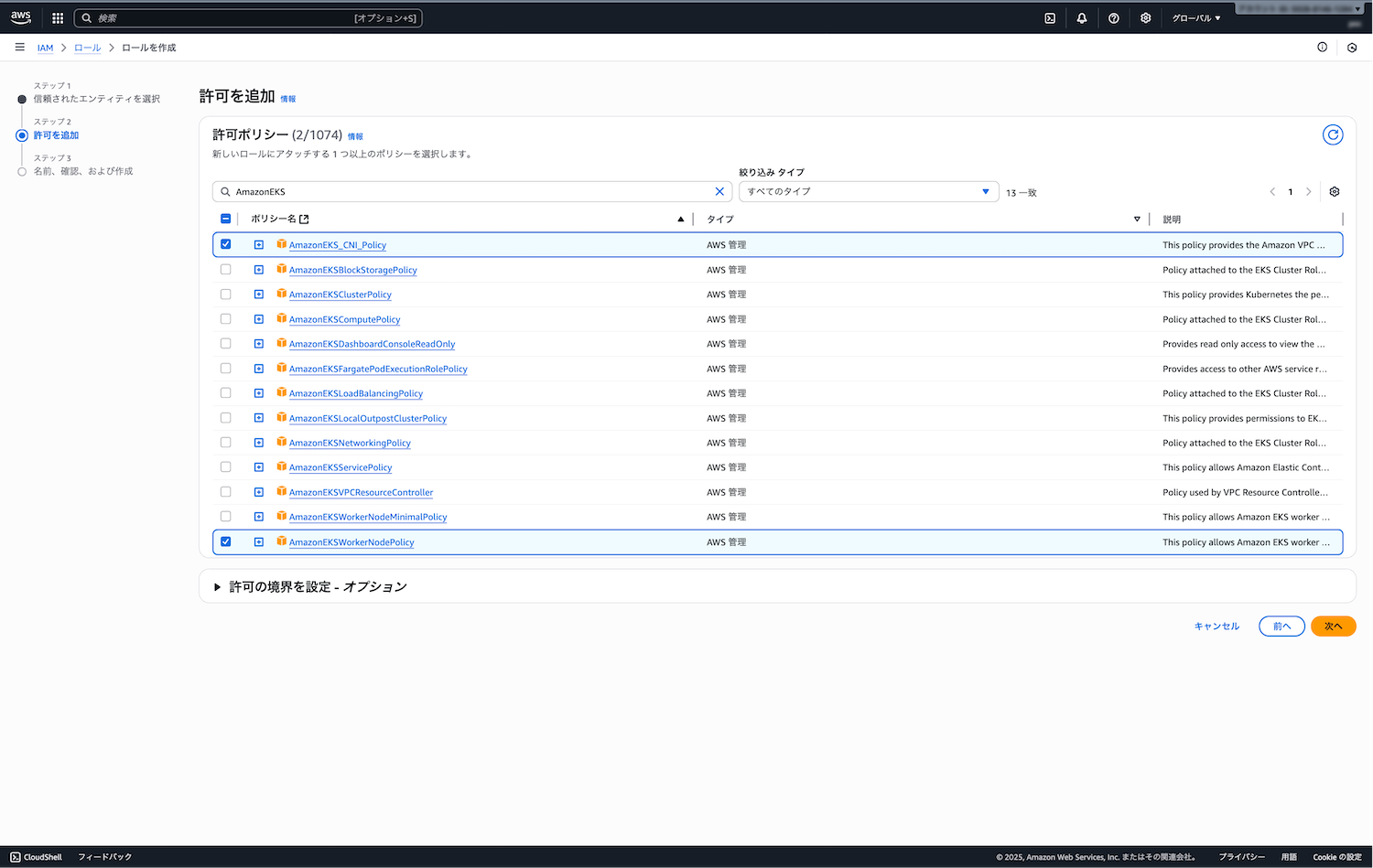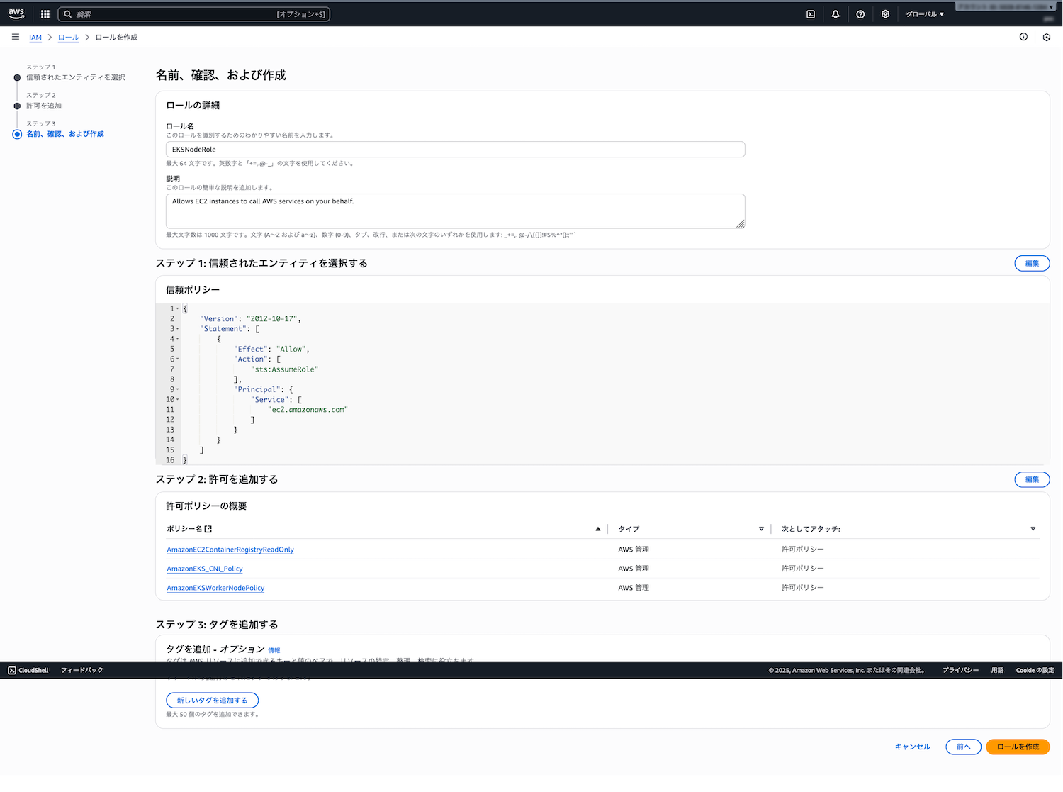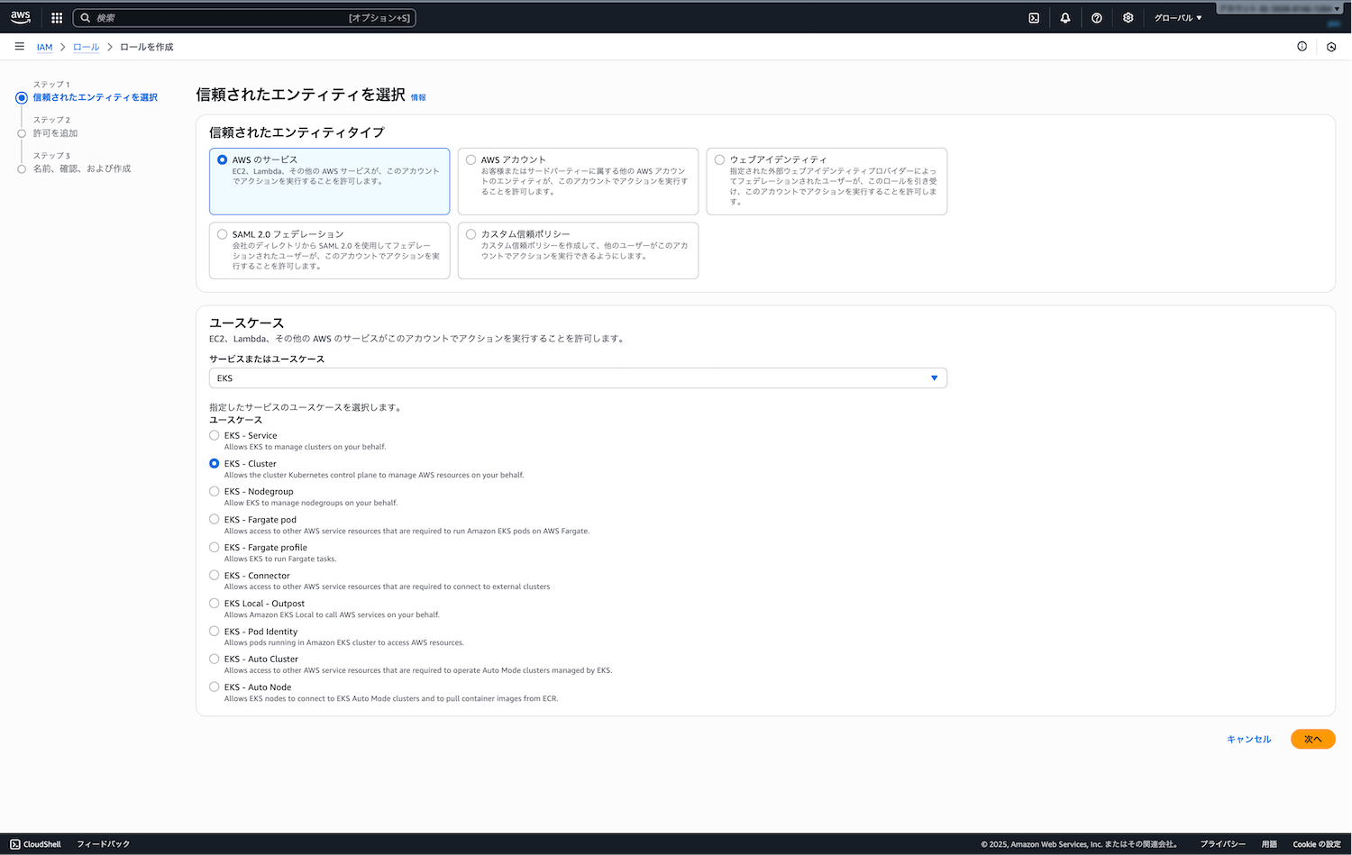 - ポリシー: 「AmazonEKSClusterPolicy」が自動選択される