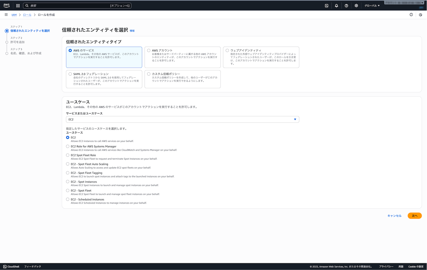 - 信頼されたエンティティタイプ: 「AWSのサービス」