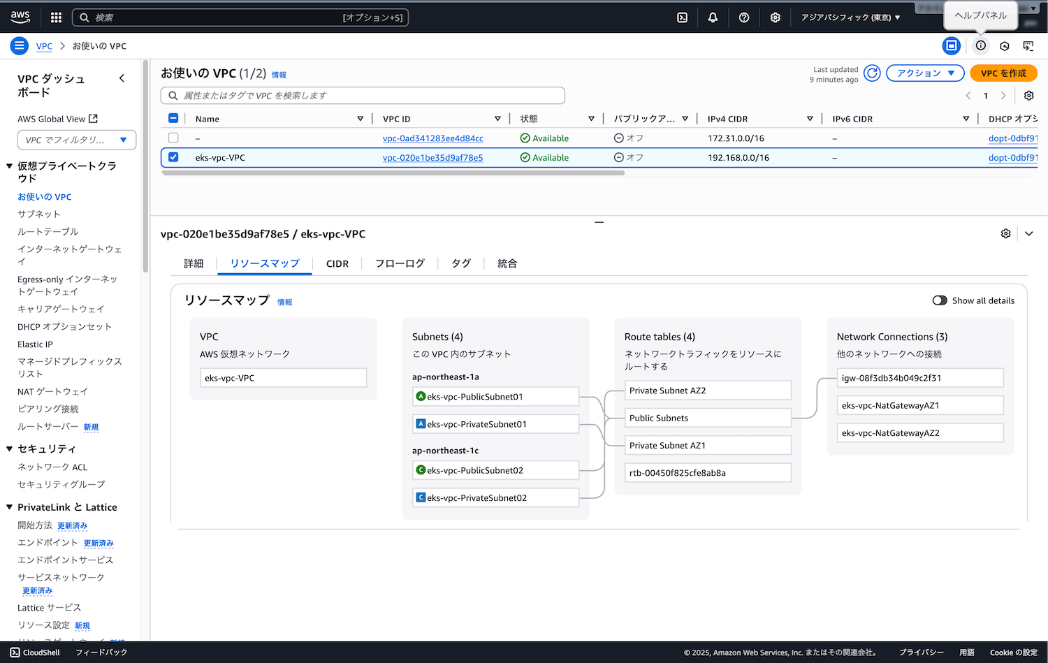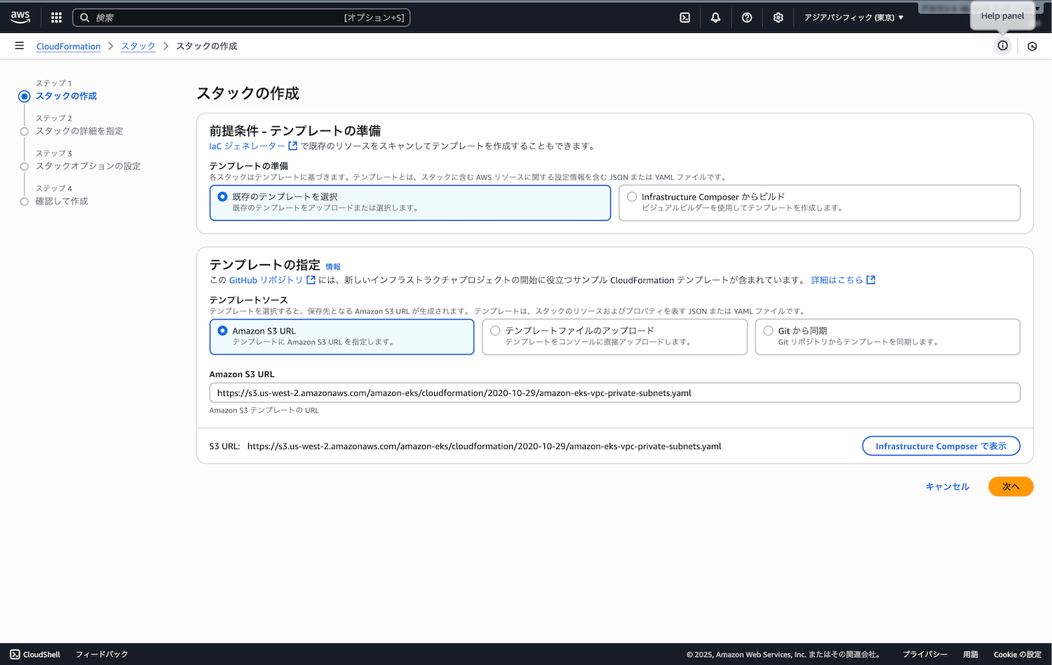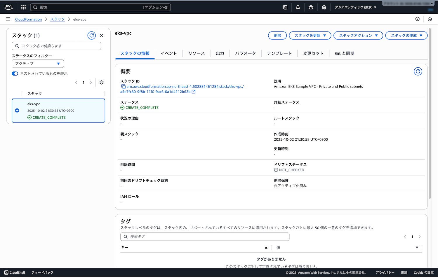 CloudFormationコンソールから、eks-vpc