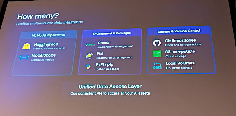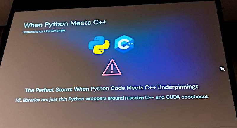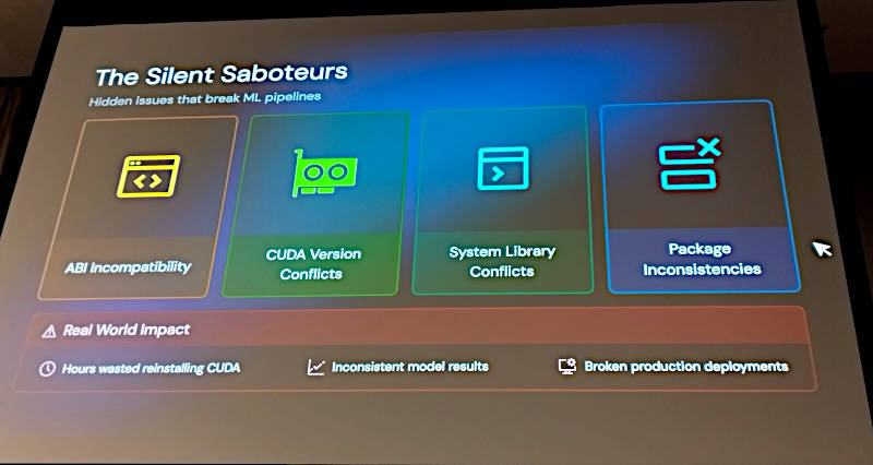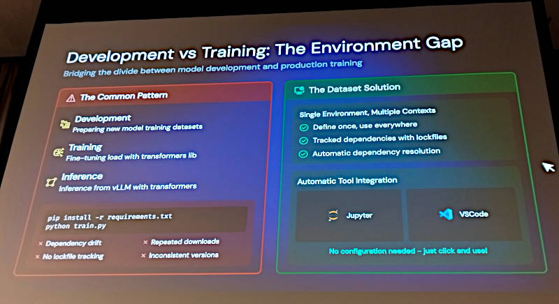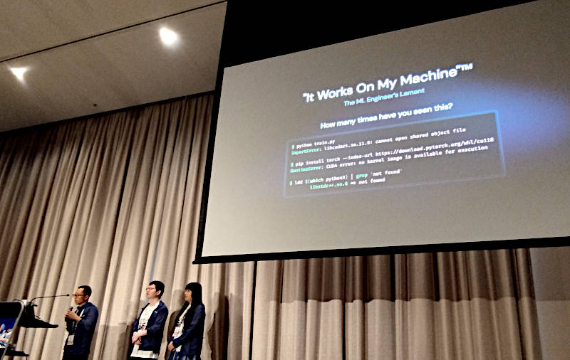 最初にチームのリーダーであるPan氏が、LLM開発における課題について解説。開発に利用するPythonに代表される依存関係、モデルやデータセットの管理、データに関するガバナンスの3つの観点から、それぞれ問題点を列挙した。特に「私のマシンでは動いていた(けど本番環境ではエラーとなる)」問題については機械学習のデベロッパーにおいて頻繁に発生していると説明した。