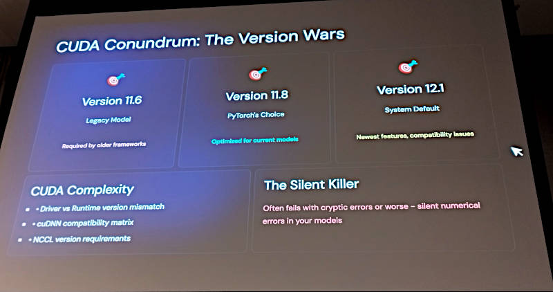 CUDAについても利用するパッケージやライブラリーがどのバージョンを要求するのかによって複雑さが増し、最終的には互換性や必要なモジュールがインストールされていないなどの問題が発生することを指摘した。